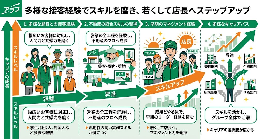 エイブルの営業職として働く最大のメリットは、圧倒的な数の接客を通じて、不動産業界における汎用的なスキルを短期間で身につけられる点にあります。