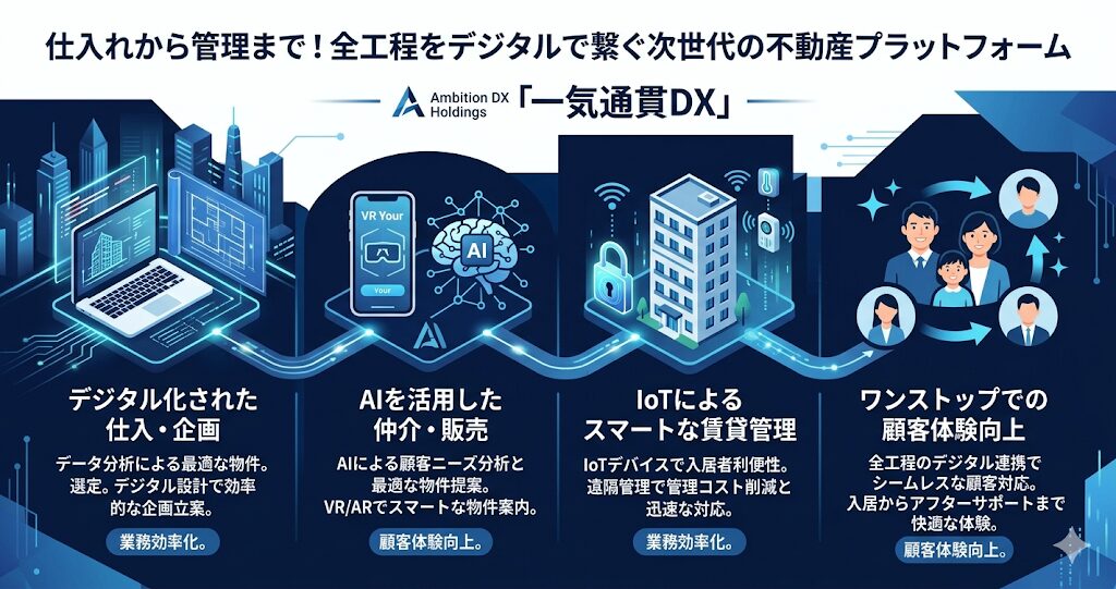 アンビション DX ホールディングスの最大の強みであり、他社と完全に一線を画しているのが、不動産ビジネスの全工程をデジタル化する「一気通貫DX」の実現です。