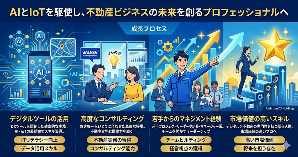 アンビション DX ホールディングスの営業職として働く最大のメリットの一つが、最先端の不動産DXの仕組みに日常的に触れながら、ITリテラシーと不動産実務の両方をハイレベルに習得できる点にあります。