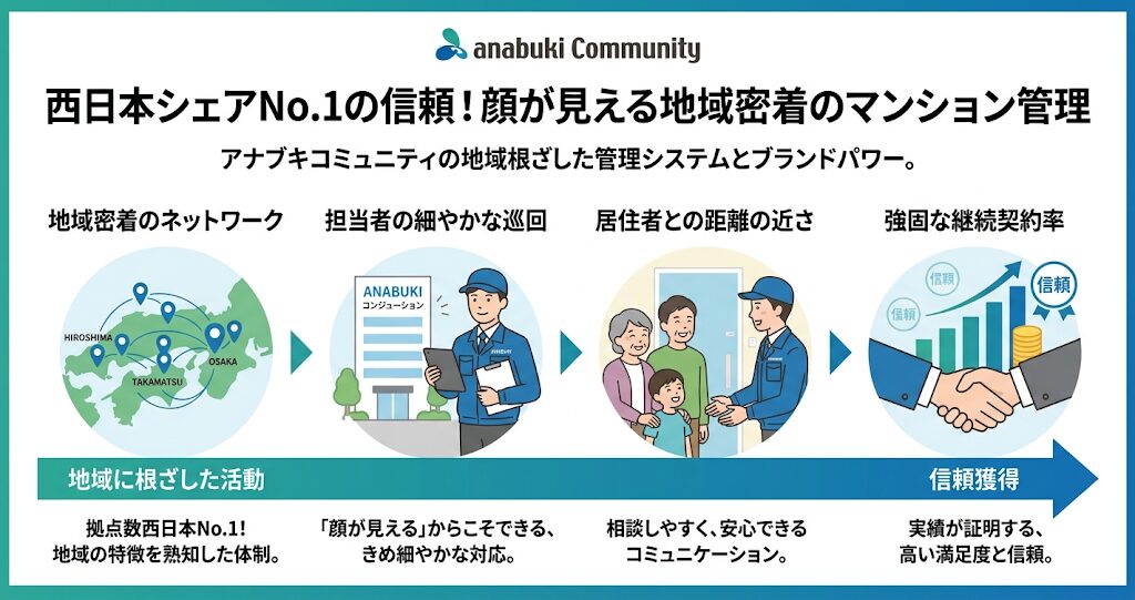 穴吹コミュニティの最大の強みの一つが、創業の地である中四国や九州といった西日本エリアにおける、圧倒的なシェアとブランド力です。