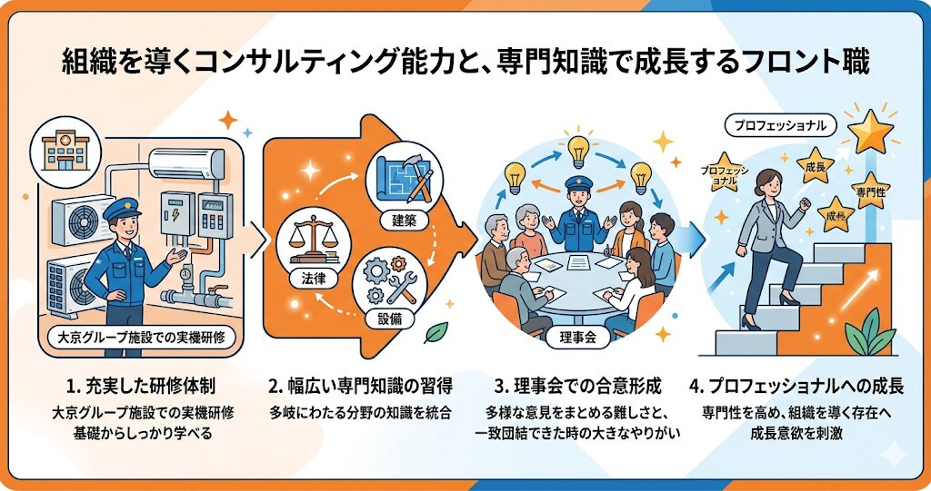 穴吹コミュニティのフロント職として働く最大のメリットの一つが、マンションの管理組合という「組織」に対する高度なコンサルティングスキルが身につく点にあります。