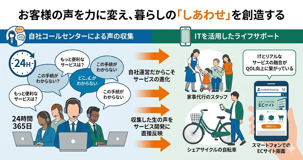 まず1つ目の大きな特徴は、業界に先駆けて設置された、24時間365日対応の自社運営「あなぶきコールセンター」です。