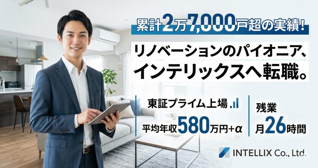 不動産業界で営業職への転職をご検討されている社会人の皆様、本日は株式会社インテリックス(INTELLIX Co., Ltd.)について詳しくご紹介させていただきますね。 「リノ...