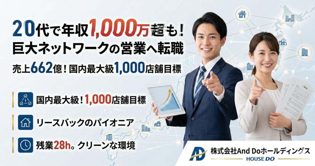 不動産業界で営業職への転職をご検討されている社会人の皆様、本日は株式会社And Doホールディングス(ブランド名:ハウスドゥ)について詳しくご紹介させていただきま... -