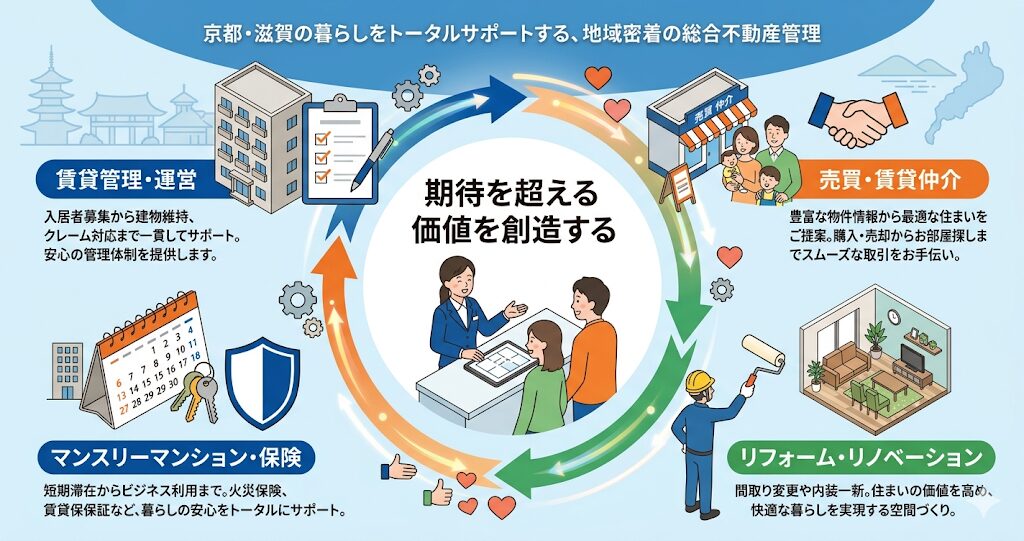 まず1つ目の大きな特徴は、京都・滋賀エリアにおいてトップクラスとなる「約28,000戸超」という、とてつもない数の管理戸数を誇っている点です。