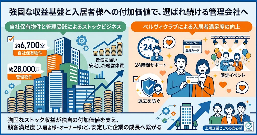 自社で所有している物件が約6,700室以上もあるため、そこから得られる家賃収入と、管理を任されている物件からの管理費という、二つの安定した収益源を持っているんです。