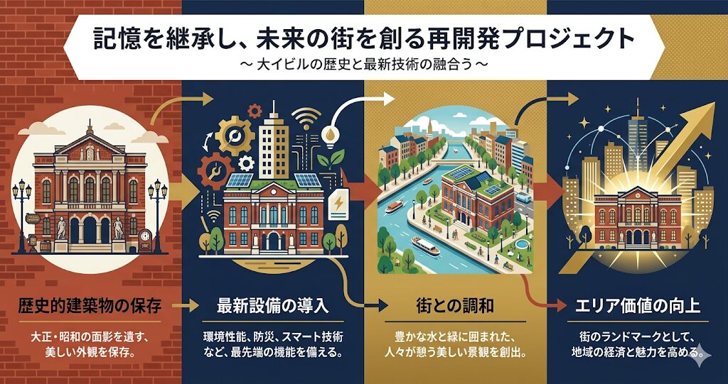 その土地が持つ記憶や美しい外観を継承しながら、内部には最新のスペックを備えたビルへと生まれ変わらせる手法は、本当に見事です。