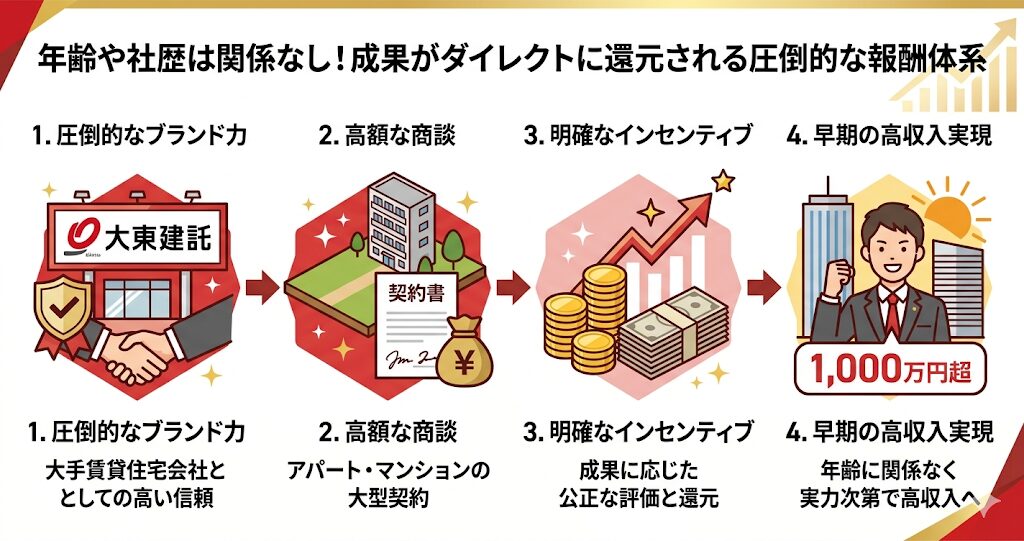 大東建託の営業職として働く最大の魅力であり、多くの方が挑戦する理由が、その「極めて透明性の高い報酬体系と実力主義」にあります。