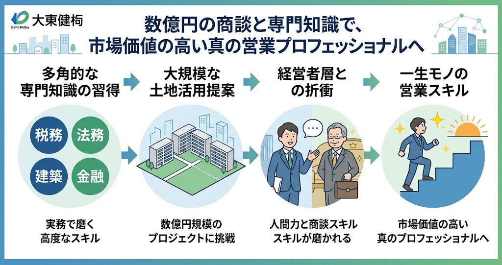 大東建託の営業職として働く最大のメリットは、数千万円から数億円という非常にスケールの大きな土地活用提案を通じて、ビジネスパーソンとして圧倒的に成長できる点にあります。