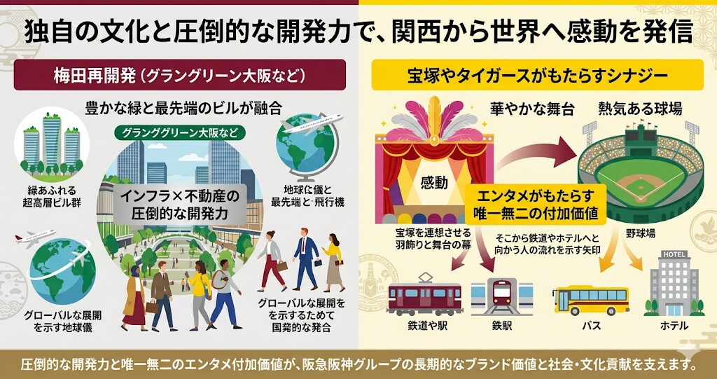 特に大阪の心臓部である「梅田」周辺の再開発プロジェクトにおいては、日本最大級の商業エリアを自らの手で形成し、運営するという、非常に強力なリーダーシップを発揮されています。