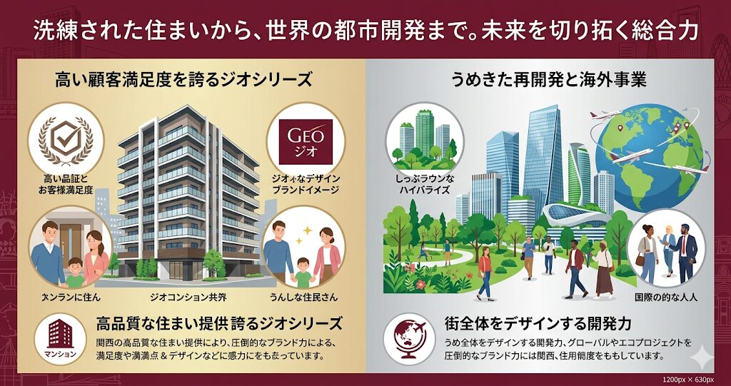 まず1つ目の大きな特徴は、関西圏を中心に展開する分譲マンションブランド「ジオ(Geo)」の圧倒的なブランド力と信頼性の高さです。
