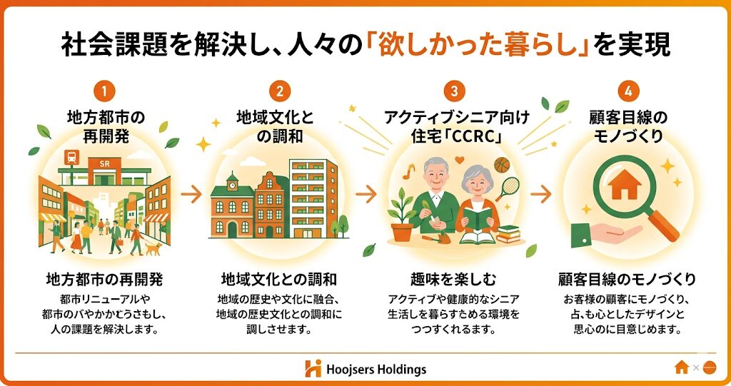 大手デベロッパーがなかなか手を出しにくい地方の中核都市での再開発や、アクティブシニアの方々に向けた住宅開発において、他にはない強みを持っています。
