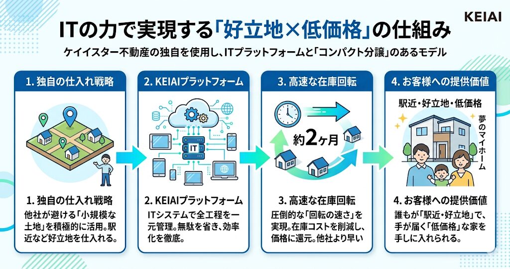 そして何より注目すべきは、ITを活用した独自の「KEIAIプラットフォーム」です。このシステムにより、用地の仕入れから建築、販売に至るまでの全工程を驚くほど効率化しているんです。