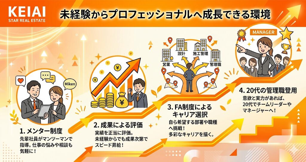 ケイアイスター不動産に入社する大きなメリットとして、未経験からでも着実に成長できる手厚いサポート体制が挙げられます。