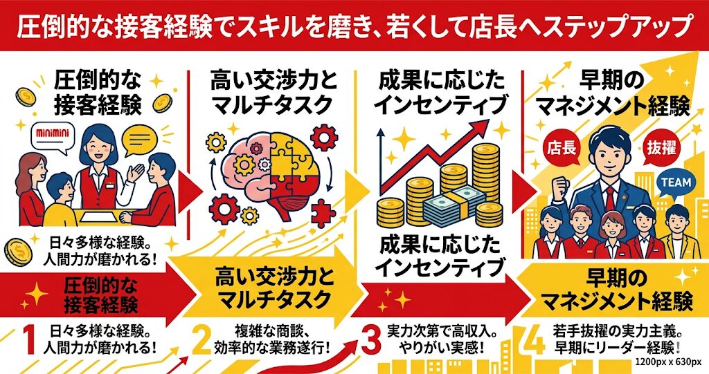 ミニミニの営業職として働く最大のメリットは、圧倒的な数の接客を通じて、短期間でビジネスパーソンとして大きく成長できる点にあります。