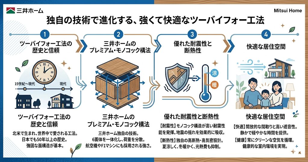 三井ホームの最大の強みであり、その歴史そのものと言えるのが「ツーバイフォー工法」です。