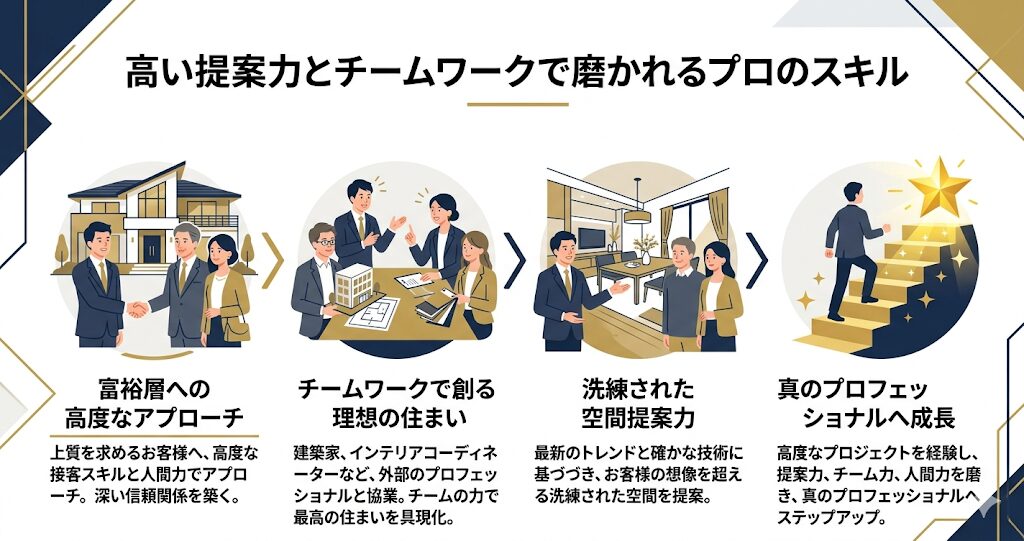 お客様の「憧れ」を丁寧にヒアリングし、想像以上の素晴らしい空間デザインとしてご提案できることは、営業担当者にとって最高にクリエイティブで楽しい瞬間になるはずです。