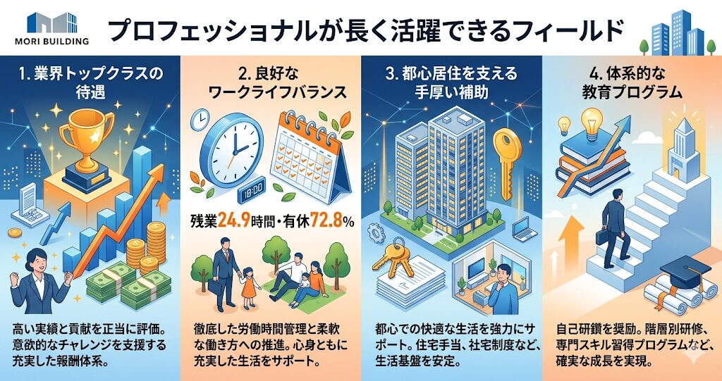 特に「DNA研修」では、森ビルが大切にしてきた街づくりの哲学を深く学ぶことができ、ご自身の仕事への誇りがさらに高まる素晴らしい機会となるはずです。