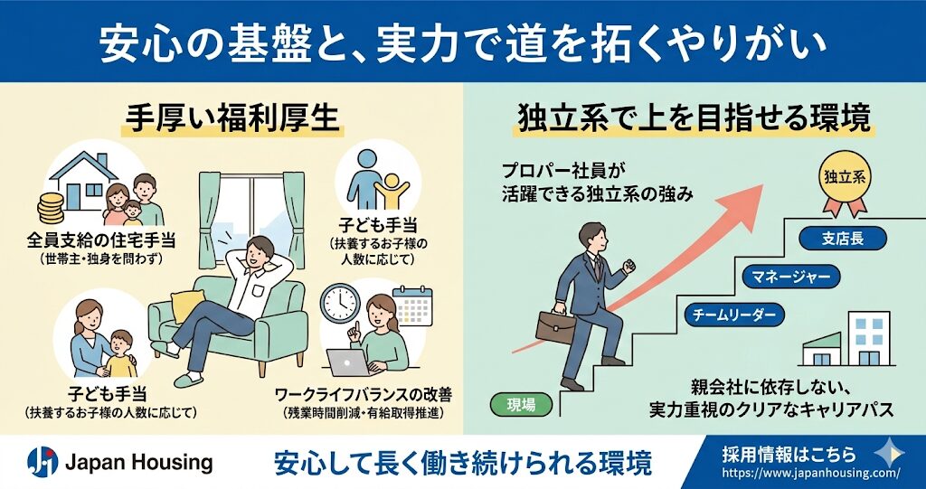 日本ハウズイングでは、社員の皆さまが安心して長く働けるような制度が驚くほど充実しているんです。