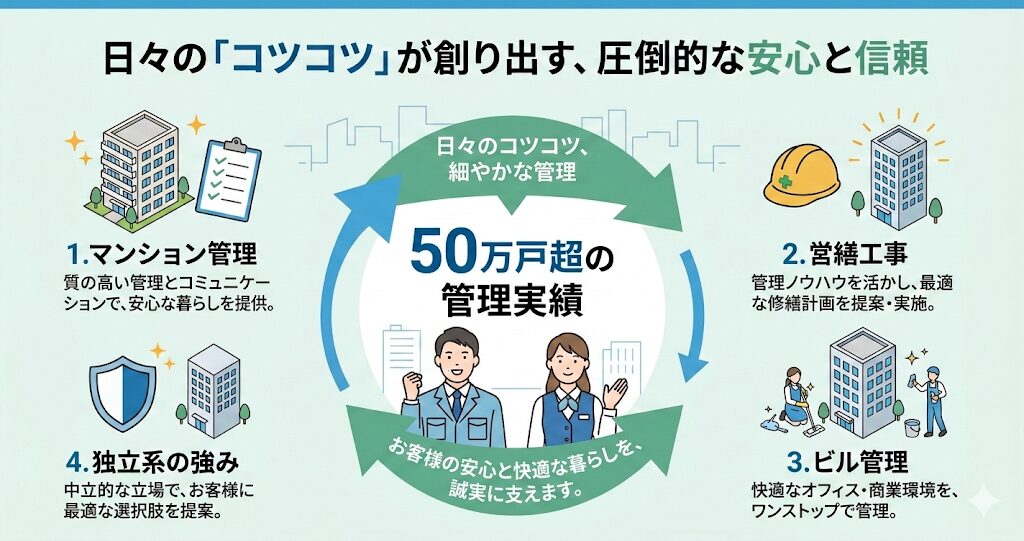 まず1つ目の大きな特徴は、デベロッパー(開発会社)の系列ではない「独立系」の管理会社として、受託管理戸数で国内最大級(50万戸超)の実績を誇っている点です。