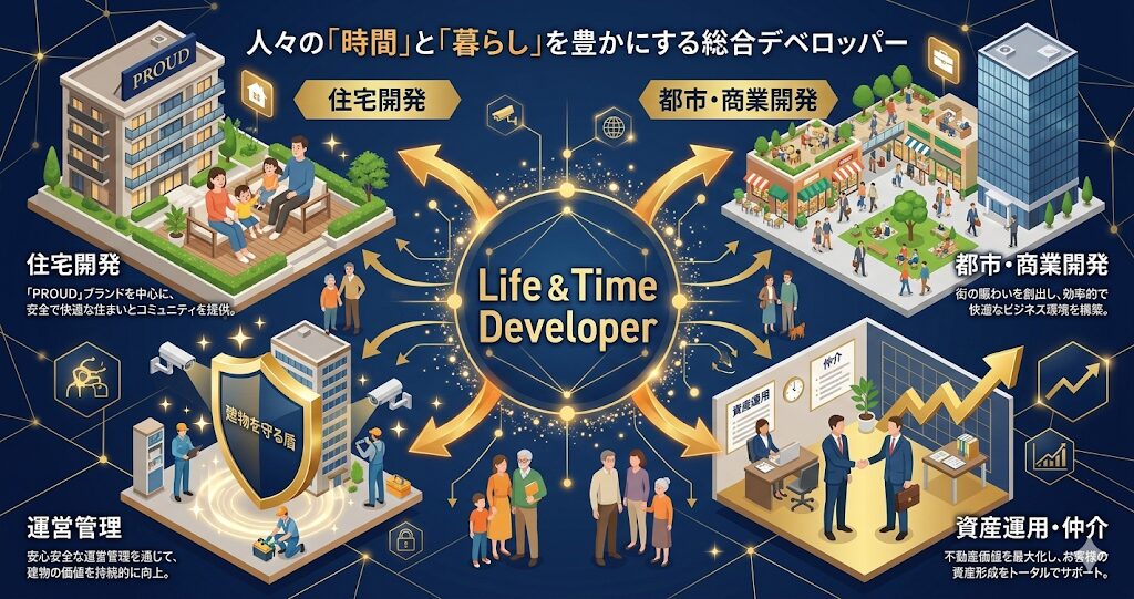 こちらの会社は、「あしたを、つなぐ」というグループ理念を掲げ、単なる建物の開発者ではなく、一人ひとりの生活や時間に寄り添う「Life & Time Developer」への進化を目指していらっしゃいます。