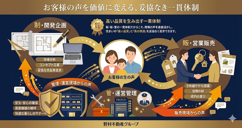 まず1つ目の大きな特徴は、圧倒的なブランド力を誇る分譲マンション「プラウド(PROUD)」に象徴される、徹底した「製販管一貫体制」です。