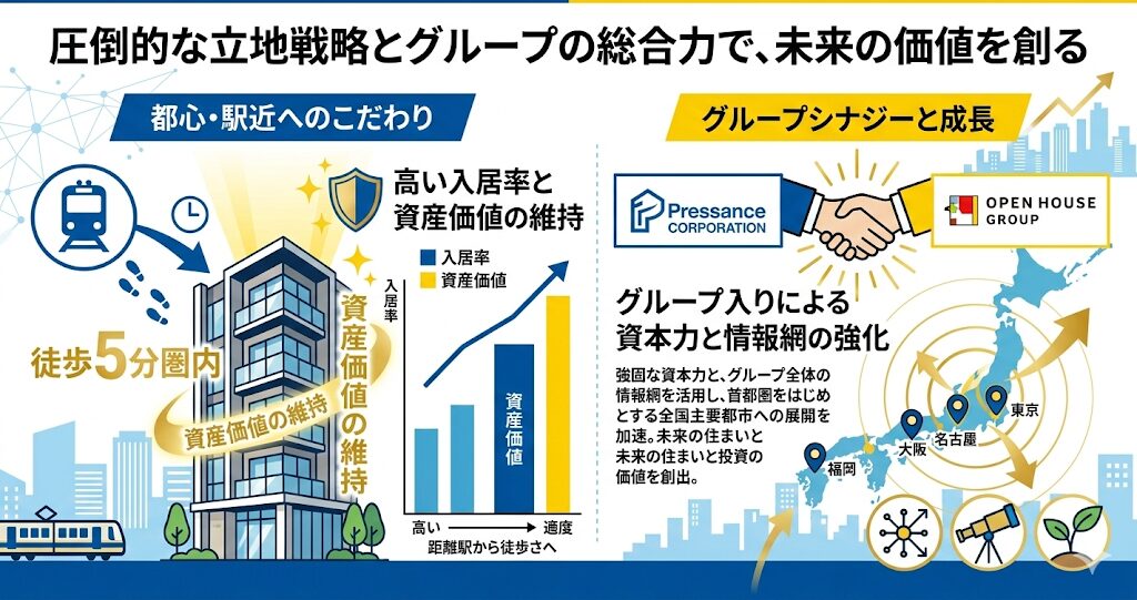 続いては、プレサンスコーポレーションが他の不動産デベロッパーと比べてどのような独自性を持っているのか、その特徴を3つの視点から詳しく見ていきましょう。