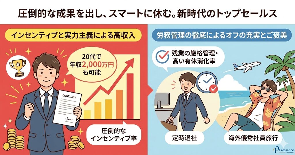 | 平均年収 | 1,098万円 (営業職は歩合給の比重が非常に高く、20代で2,000万円超えも可能) |