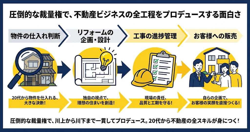 単に完成した物件を売るだけの営業ではありません。どの物件を買い取るかという「仕入れ」の判断から、どのようなリフォームをするかという「企画」、そして実際の「販売」までを担当します。