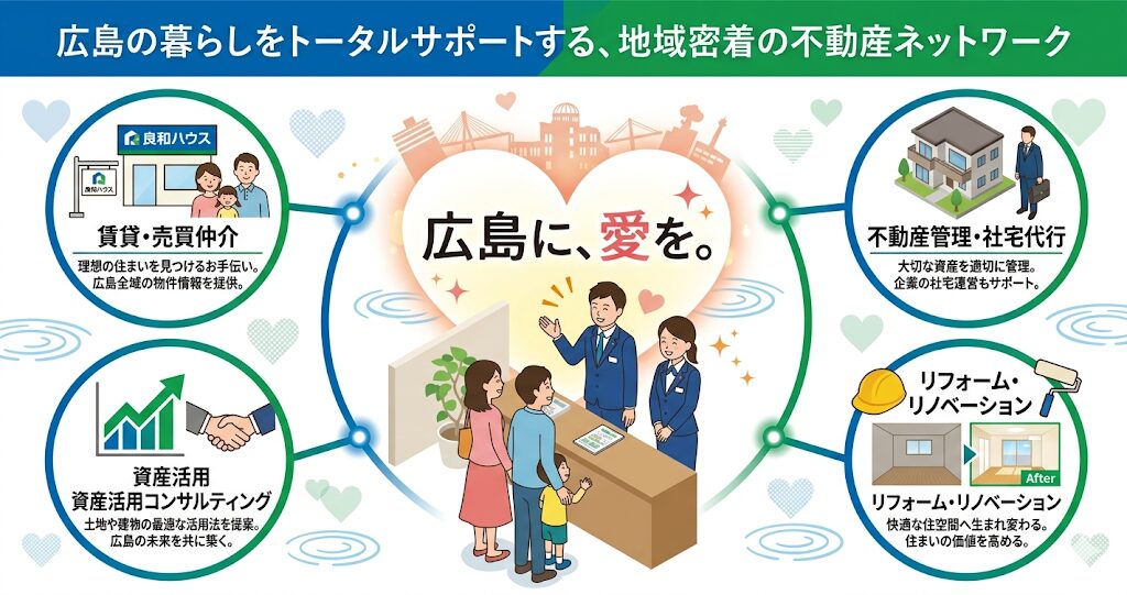 今回は、広島で「広島に、愛を。」のスローガンとテレビCMでおなじみ、圧倒的な知名度とシェアを誇る不動産会社「株式会社良和ハウス」について、詳しくお話しさせていただきますね。