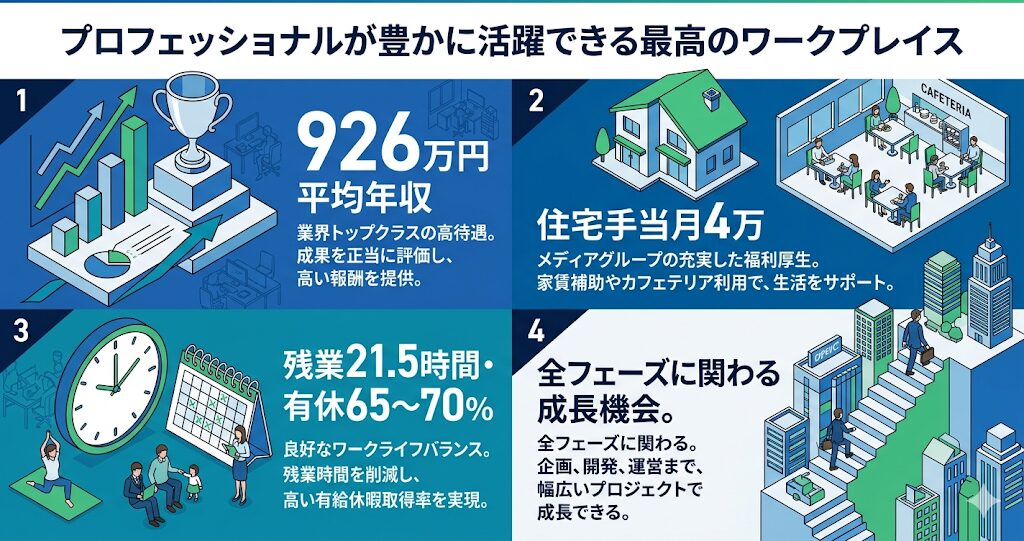 高水準の年収や、メディアグループならではの驚くほど手厚い福利厚生について、具体的な数字も交えながらお伝えしますね。