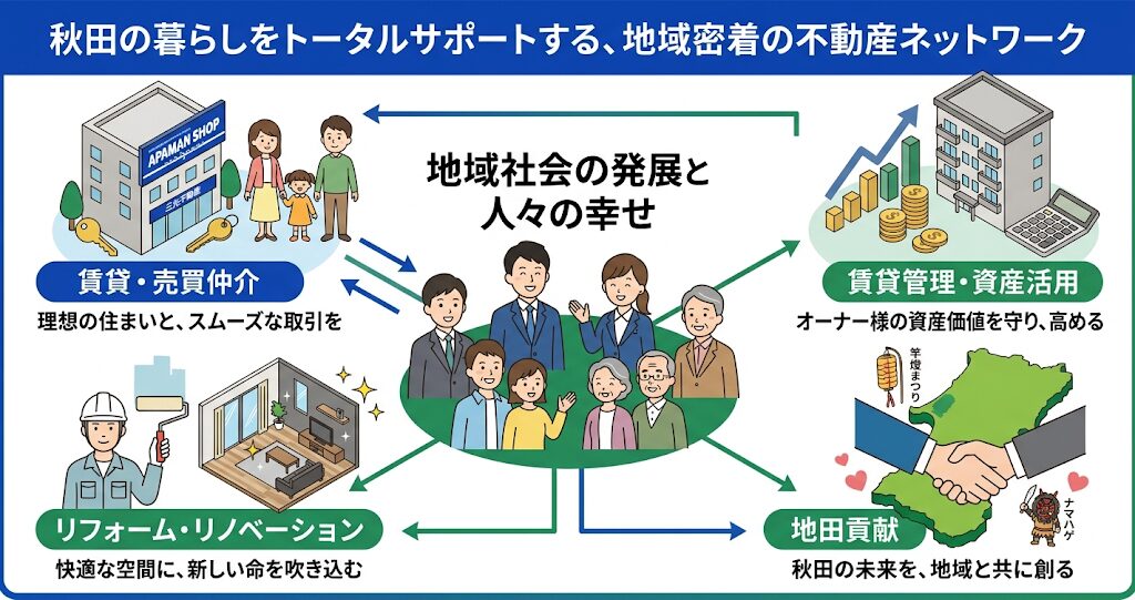 まず1つ目の大きな特徴は、秋田市を中心に「アパマンショップ」を多数展開し、秋田県内でトップクラスの管理戸数とシェアを誇っている点です。