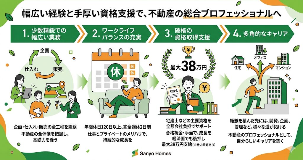 サンヨーホームズの営業職として働く最大のメリットの一つが、若手のうちから幅広い業務に携わり、圧倒的なスピードで成長できる環境がある点です。