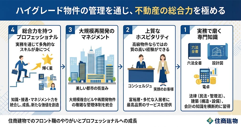 住商建物のフロント職や営業職として働く最大のメリットの一つが、ハイグレード物件の管理を通じて、非常に高度で幅広い専門スキルをバランスよく習得できる点にあります。