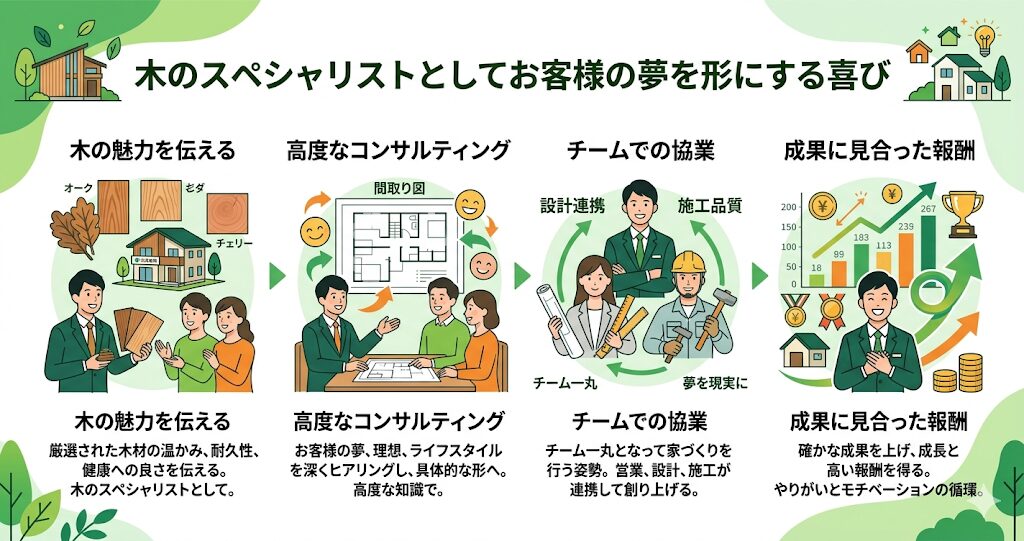 住友林業の営業職として働く最大のメリットは、日本を代表する「木のスペシャリスト」として、自信と誇りを持ってお客様にご提案できる点にあります。