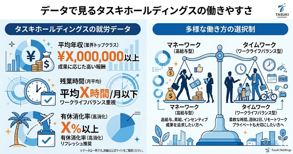 タスキホールディングスに就職する大きなメリットの一つが、「マネーワーク」と「タイムワーク」という独自の選択制です。