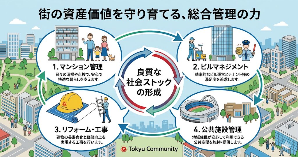 東急コミュニティーの事業の柱は、なんといってもその幅広い「管理事業」にあります。