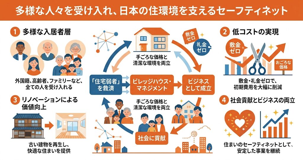 かつての「雇用促進住宅」を一括で取得し、「ビレッジハウス」としてリブランディング。敷金・礼金・更新料・仲介手数料がすべて無料という、圧倒的な低コストモデルで「住まいのセーフティネット」としての役割を力強く担っています。