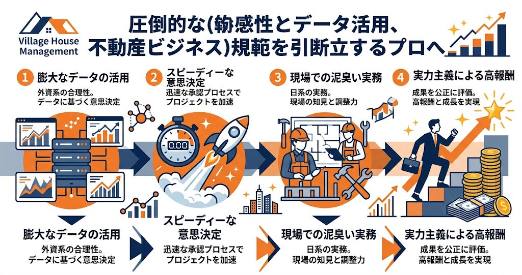 ビレッジハウス・マネジメントに入社する最大のメリットの一つが、外資系企業のフラットで合理的な文化と、日系不動産の泥臭い実務を、同時に経験できる点にあります。